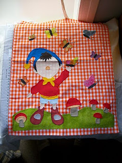 Aquí os muestro una aplicación con festón que he hecho en una bolsa para regalar a una niña que le encanta este personaje. Aun faltan los detalles de la cara, setas y pañuelo. En cuanto, lo tenga listo os lo muestro. Estoy contenta de ste trabajillo...jejejeje.